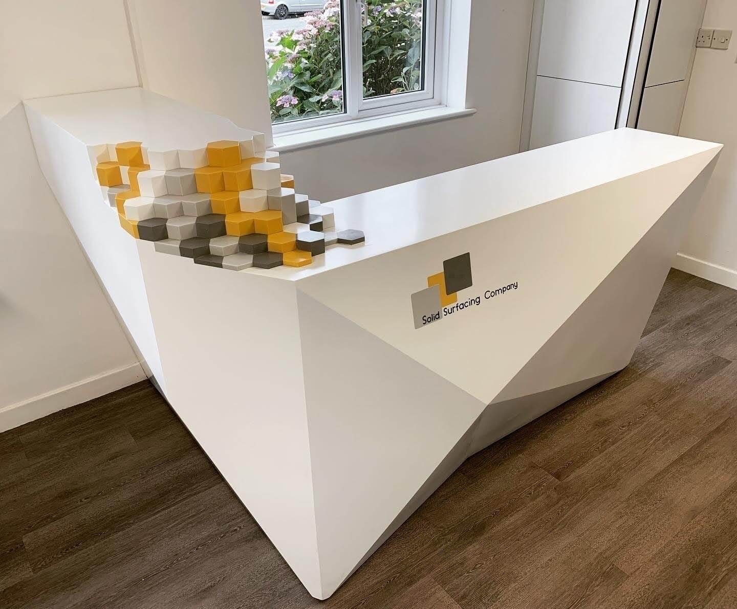 Seamless Integration: Corian is a solid surface material known for its ability to be moulded and shaped into virtually any design, including seamless integrations. This can be particularly useful for creating custom reception counters with integrated sinks, lighting, or branding elements without visible joints or seams.